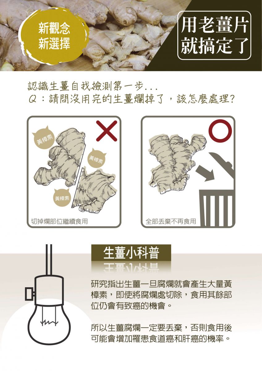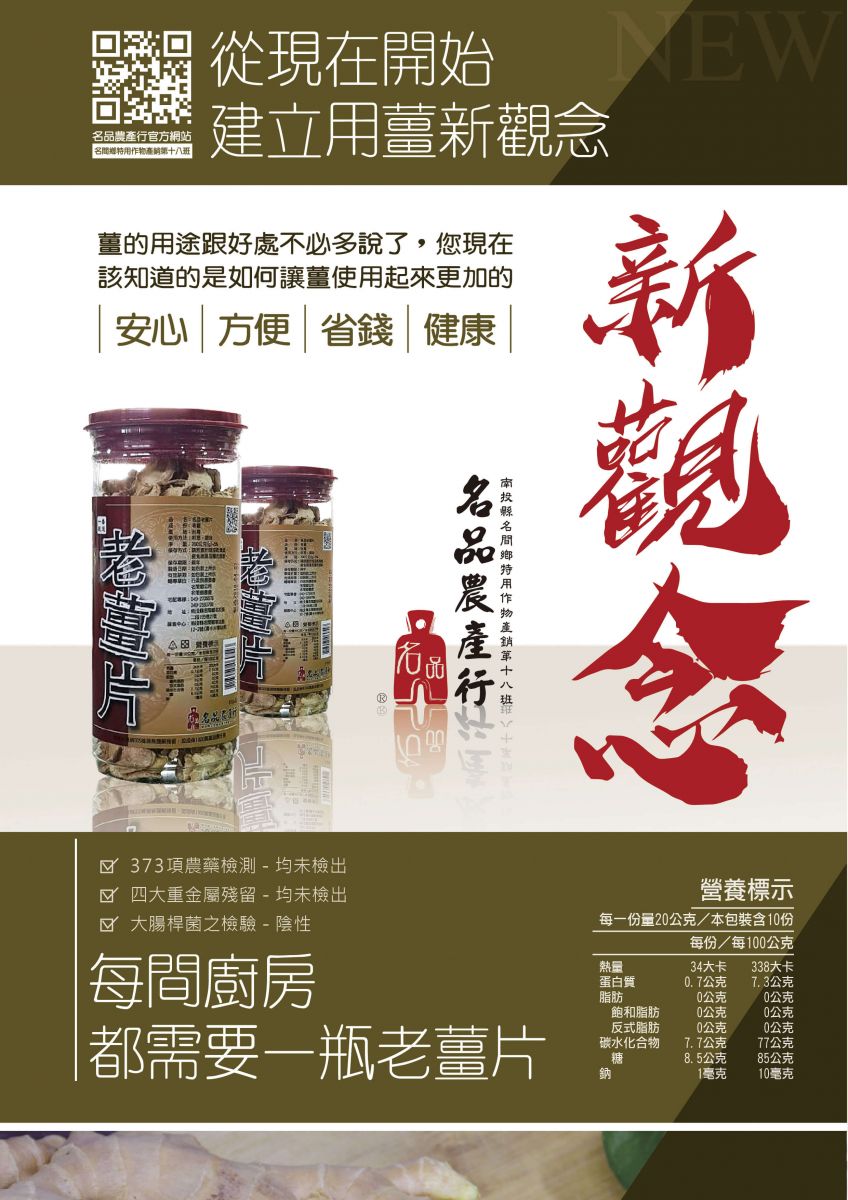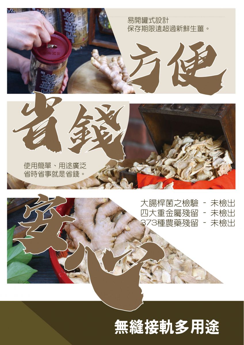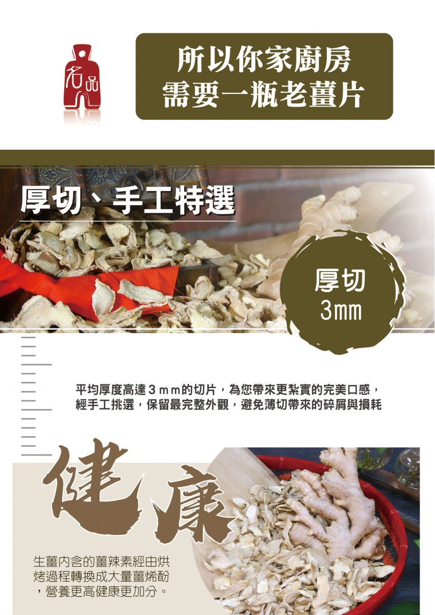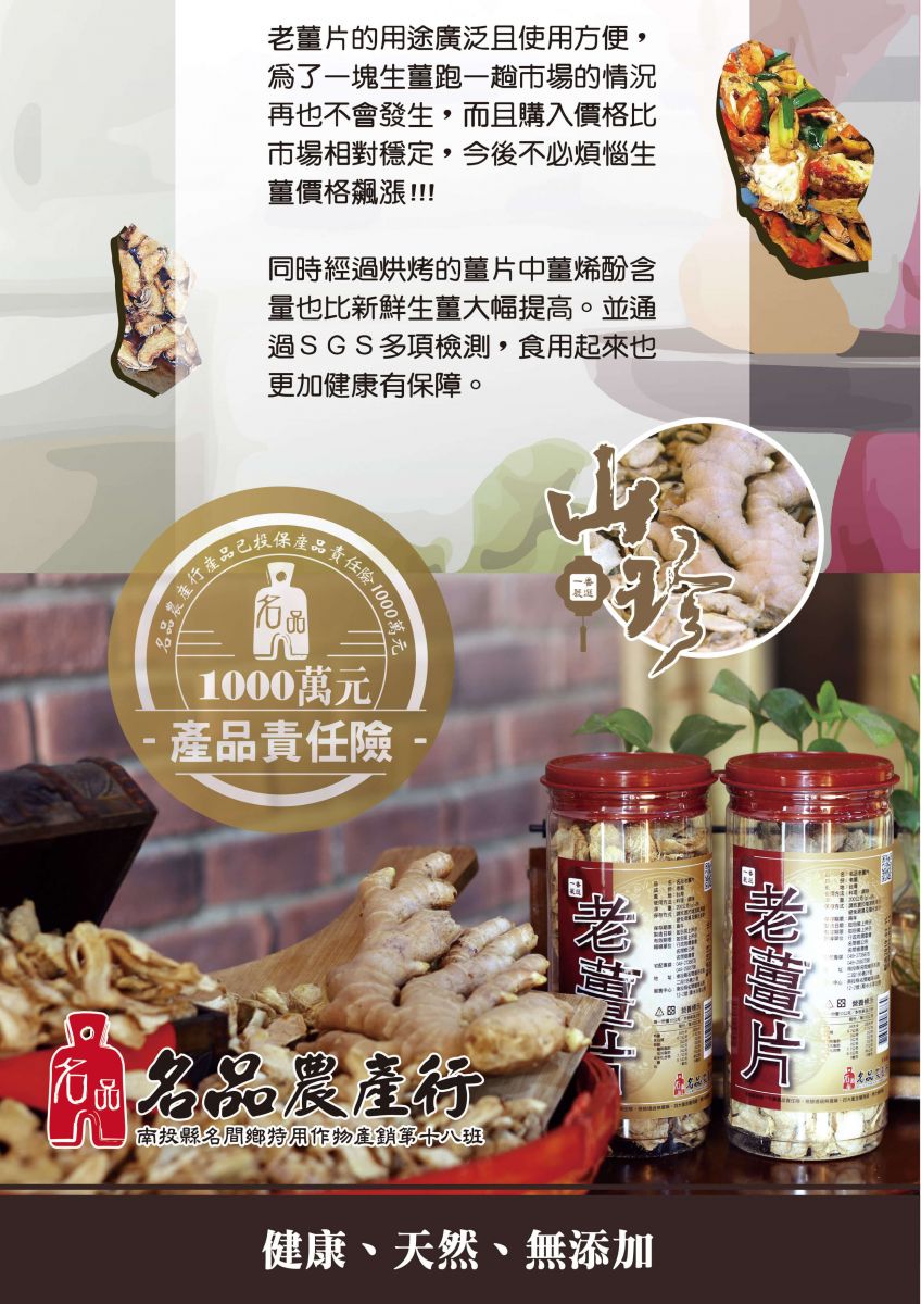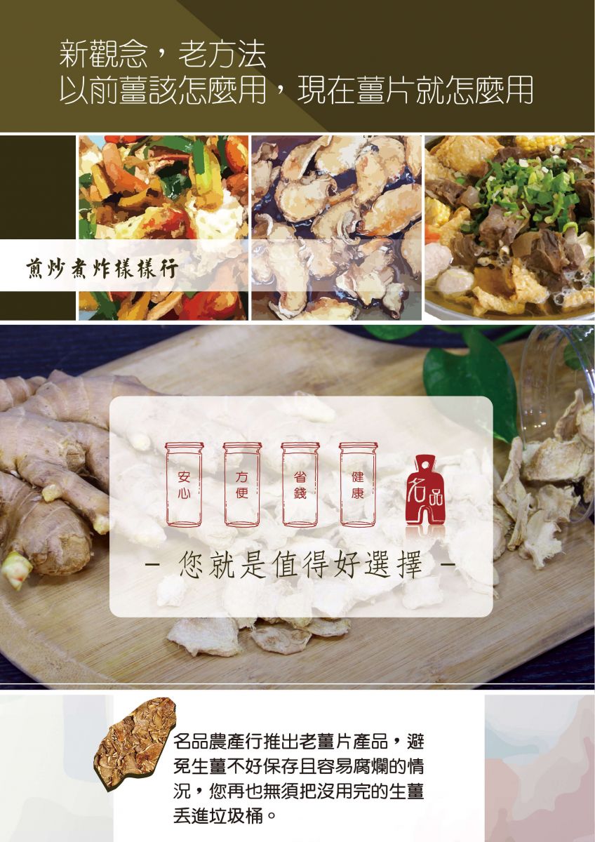 名品農產行推出老薑片產品,顛覆以往傳統用薑的概念,讓您生薑使用的體驗指數攀升,更加的安全、方便、健康、省錢!